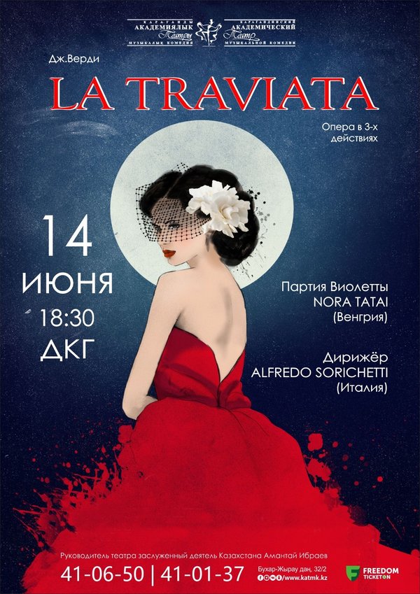 уреат международного конкурса Тахауи Рахметов, для которого эта роль также стала премьерной. В его отца Жоржа Жермона на этот вечер перевоплотился знаменитый казахстанский баритон, солист театра «Астана Опера», дипломант международных конкурсов Талгат Галеев. Дирижировал симфоническим оркестром театра известный дирижер из Италии, украсивший в свое время своим мастерством выступления в более чем двадцати странах Европы, Америки и Азии, артистический директор фестиваля «Опера-симфония» маэстро Альфредо Сорикетти. Все остальные партии в опере исполнили наши замечательные солисты, артисты хора и балета КАТМК. Для некоторых из них роли тоже стали премьерными. Мы с удовольствием поздравляем с премьерой лауреата международного конкурса Елену Федорову, исполнившую партию Аннины, дипломанта международного конкурса Виталия Ковалева (Барон Дюфоль) и Алексея Гусака (Маркиз д’Обиньи). Желаем всем новых интересных ролей и дальнейших творческих побед и достижений!