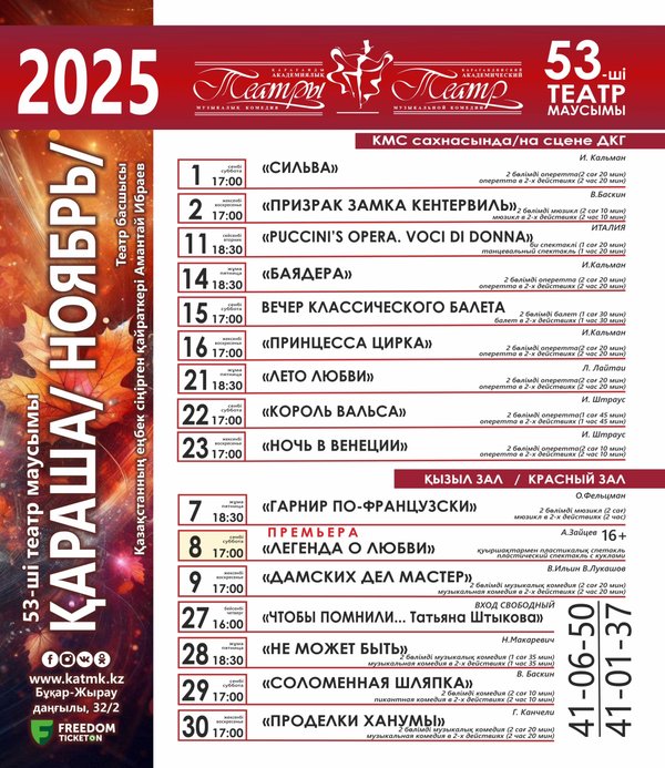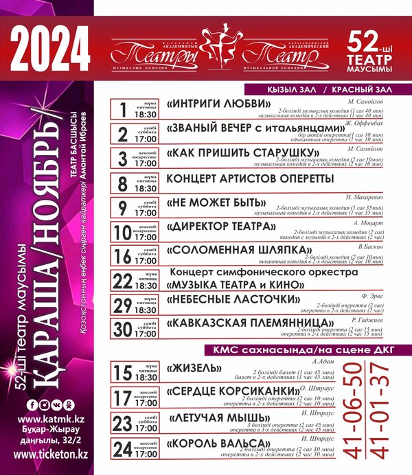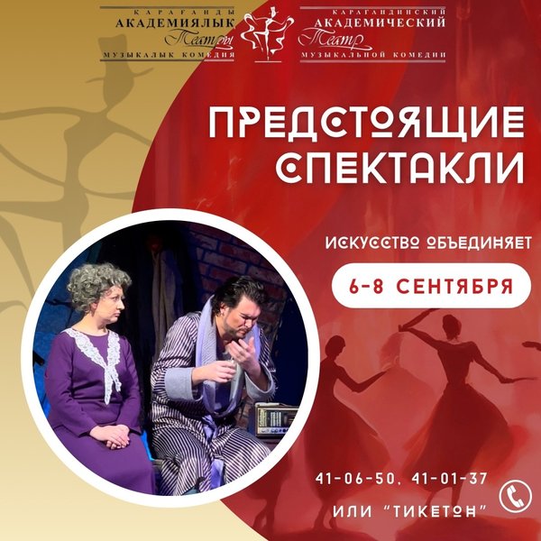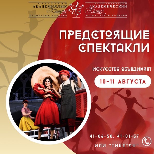 ️Қарағанды академиялық музыкалық комедия театры ҚАРАША айына репертуар ұсынады. Билеттерді кассадан сатып алыңыз (Бұқар жырау даңғылы, 32/2, тел. 41-06-50), әкімшіден 41-01-37 телефоны арқылы немесе «Тикетон» сайтынан онлайн тапсырыс беріңіз. ️Карагандинский академический театр музыкальной комедии представляет репертуар на НОЯБРЬ Приобретайте билеты в кассе (пр.Бухар-Жырау, 32/2, тел. 41-06-50), онлайн на сайте «Тикетон» или заказывайте у администраторов по тел. 41-01-37
