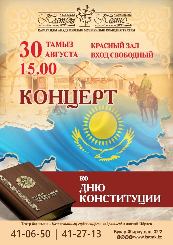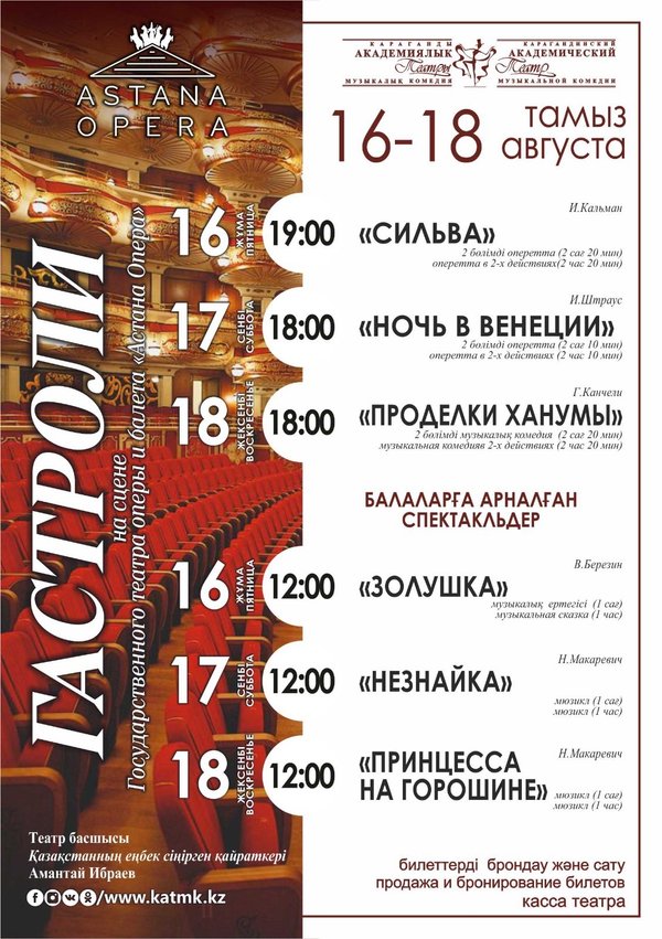 ратино» ️ҚЫЗҒЫЛТ ЗАЛ (БАЛАЛАРҒА АРНАЛҒАН ИНТЕРАКТИВТІ ЕРТЕГІ) 3 тамыз, 10.30 – «Весёлые медвежата» 4 тамыз, 10.30 – «Федорино горе» МУЗЫКА АВГУСТА С Карагандинским академическим театром музыкальной комедии лето будет еще ярче! Приходите к нам 3—4 августа на спектакли: ️КРАСНЫЙ ЗАЛ 3 августа, 17.00 - Р. Гаджиев «Кавказская племянница», оперетта в 2-х действиях 4 августа, 17.00 - Г. Канчели «Проделки Ханумы», музыкальная комедия в 2-х действиях ️ СПЕКТАКЛИ ДЛЯ ДЕТЕЙ 3 августа, 11.00, Красный зал — «Бременские музыканты», музыкальная сказка 4 августа, 11.00, Красный зал – «Принцесса на горошине», мюзикл ️ ТЕАТР-СТУДИЯ КУКОЛ «БУРАТИНО» 3 августа, 11.30 – «Гуси-лебеди» 4 августа, 11.30 — «Приключение Буратино» ️ РАДУЖНЫЙ ЗАЛ (ИНТЕРАКТИВНЫЕ СКАЗКИ ДЛЯ МАЛЫШЕЙ) 3 августа, 10.30 – «Весёлые медвежата» 4 августа, 10.30 — «Федорино горе» Полное расписание в Актуальных сторис, приобретайте билеты в кассе (пр.Бухар-Жырау, 32/2, тел. 41-06-50, заказывайте у администраторов по тел. 41-01-37 или онлайн на сайте «Тикетон». В КАТМК всегда вам рады!