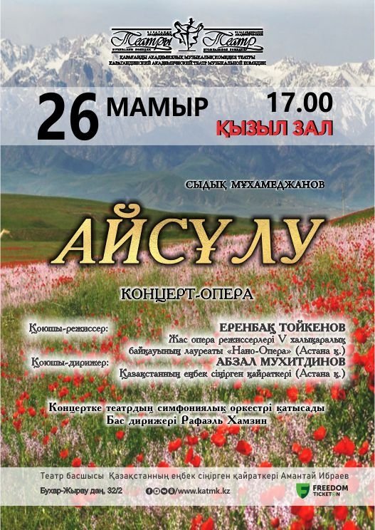 о театра. В основу либретто Куандыка Шангитбаева и Канабека Байсеитова положена жизнь современной казахской молодежи; в центре — комедийные ситуации, в которые попадают влюбленные. Премьерная постановка спектакля «Айсулу» была осуществлена в 1964 году в ГАТОБ имени Абая. С тех пор эта опера полюбилась зрителям, а многие номера стали концертными (например, каватина Серке). Концертное исполнение оперы «Айсулу» Сыдыка Мухамеджанова проводится в рамках празднования 100-летия композитора с целью сохранения, развития и популяризации историко-культурного наследия. Приобретайте билеты в кассе (пр.Бухар-Жырау, 32/2, тел. 41-06-50), заказывайте у администраторов по тел. 41-01-37 или онлайн на сайте «Тикетон»