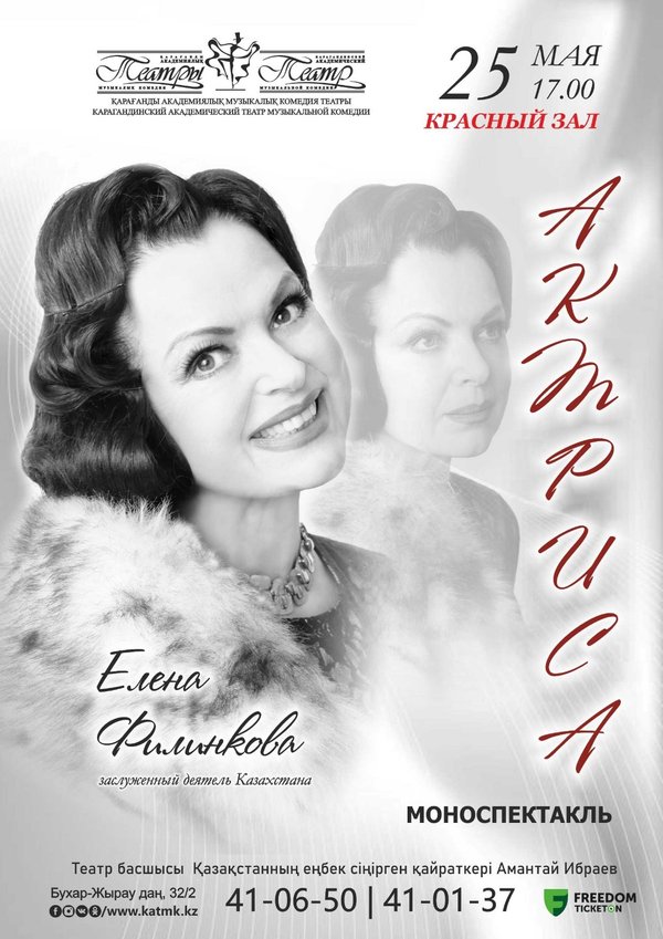 Спектакль-размышление о жизни, о профессии… Актриса вчера, сегодня и всегда! 25 МАЯ | 17:00 | КРАСНЫЙ ЗАЛ АВТОР ИДЕИ Заслуженный деятель РК Елена Филинкова ИСПОЛНИТЕЛЬ Заслуженный деятель РК Елена Филинкова КОНЦЕРТМЕЙСТЕР Жанна Шестакова Приобретайте билеты в кассе (пр.Бухар-Жырау, 32/2, тел. 41-06-50), заказывайте у администраторов по тел. 41-01-37 или онлайн на сайте «Тикетон»