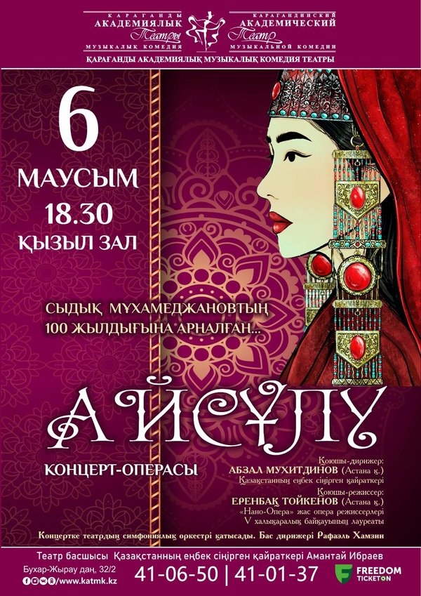 ежиссеров «Нано-Опера», режиссер театра «Астана опера». Сыдык Мухамеджанов написал первую комическую оперу в истории казахского музыкального театра. В основу либретто Куандыка Шангитбаева и Канабека Байсеитова положена жизнь современной казахской молодежи; в центре — комедийные ситуации, в которые попадают влюбленные. Премьерная постановка спектакля «Айсулу» была осуществлена в 1964 году в ГАТОБ имени Абая. С тех пор эта опера полюбилась зрителям, а многие номера стали концертными (например, каватина Серке). Концертное исполнение оперы «Айсулу» Сыдыка Мухамеджанова проводится в рамках празднования 100-летия композитора с целью сохранения, развития и популяризации историко-культурного наследия. Приобретайте билеты в кассе (пр.Бухар-Жырау, 32/2, тел. 41-06-50), заказывайте у администраторов по тел. 41-01-37 или онлайн на сайте «Тикетон»