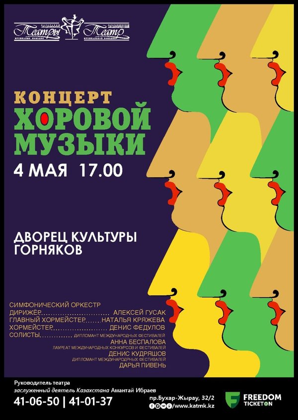 идорова Дирижирует хормейстер театра Денис Федулов. Во втором отделении хор выступит в сопровождении оркестра, исполнив величественные хоровые сцены из казахских и иностранных опер. Оно будет наполнено всем драматизмом, мощью и красотой оперной музыки, появившейся из-под пера как популярных ныне Джузеппе Верди и Петра Чайковского, Жоржа Бизе и Сергея Рахманинова, так и более редких композиторов: Джованни Баттиста Перголези, Габриеля Форе и Руджеро Леонкавалло. Этот концерт — уникальная возможность насладиться всем разнообразием хорового творчества в одном вечере. Мы пройдём путь от самых истоков хорового искусства — народного пения — к современности с её многообразием жанров, гармоническими экспериментами и сложными вокальными техниками, раскрывая эволюцию хорового искусства через века. Дирижёр — Алексей Гусак Приобретайте билеты в кассе (пр.Бухар-Жырау, 32/2, тел. 41-06-50), заказывайте у администраторов по тел. 41-01-37 или онлайн на сайте «Тикетон»