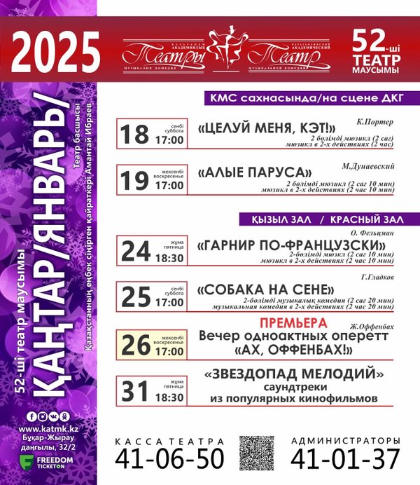 Карагандинский академический театр музыкальной комедии представляет репертуар на ЯНВАРЬ ️ Приобретайте билеты в кассе (пр.Бухар-Жырау, 32/2, тел. 41-06-50), заказывайте у администраторов по тел. 41-01-37 или онлайн на сайте «Тикетон»