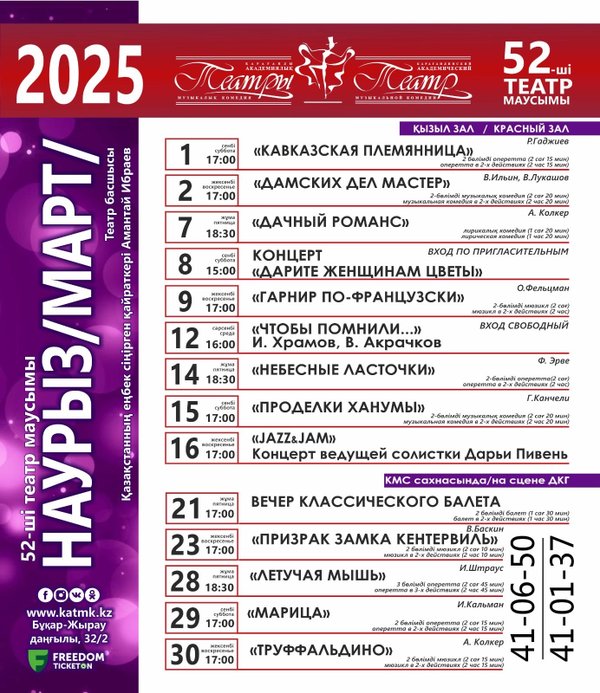 Карагандинский академический театр музыкальной комедии представляет репертуар на МАРТ Приобретайте билеты в кассе (пр.Бухар-Жырау, 32/2, тел. 41-06-50), заказывайте у администраторов по тел. 41-01-37 или онлайн на сайте «Тикетон»