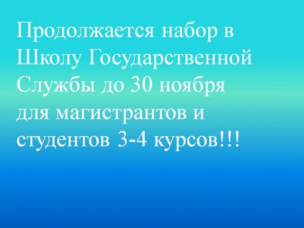 Школа государственной службы: не упусти свой шанс! 12 ноября в 16.00 в актовом зале состоится презентация проекта «Школа государственной службы». Приглашаем магистрантов и студентов 3—4 курсов принять активное участие. Для вас это отличная возможность продолжить свою карьеру в будущем!