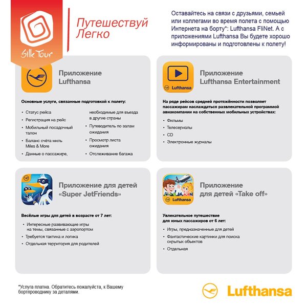 Авиапутешествие нового уровня — FlyNet® на борту. Оставайтесь на связи с друзьями, семьей или коллегами во время полета с помощью интернета на борту*: Lufthansa FlyNet®. А с приложениями Lufthansa Вы будете всегда хорошо информированы и подготовлены к полету!
