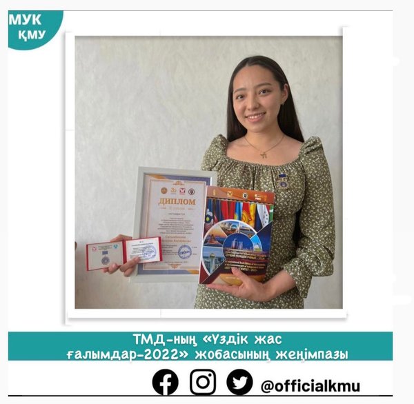 е Аңсарқызы «Үздік жас ғалым – 2022» төсбелгісімен және II дәрежелі дипломмен марапатталды. Ғылыми жетекші-клиникалық фармакология және дәлелді медицина кафедрасының оқытушысы Дилдабекова Нұрипа Тастемірқызы. Нұрипа Тастемірқызы еліміздің Білім және ғылым саласын дамытуға қосқан елеулі үлесі үшін және жас ғалымдарға жобада, сондай-ақ талантты жастарды тәрбиелеуде көрсеткен қолдауы үшін алғыс хатпен марапатталды. Фармация мектебі өзінің талантты және жас оқушыларымен мақтан тұтады және «клиникалық фармакология және дәлелді медицина» кафедрасына ерекше алғысын білдіреді. Жеңімпаздарға еліміздің медицина саласындағы білім мен ғылым жолында үлкен жетістіктер тілейді! Фармация Мектебінің академиялық және әлеуметтік жұмыс жөніндегі декан орынбасары Шакаримова Куаныш Казбековна!!! _____________________________________________ Победа в проекте СНГ «Лучшие молодые ученые — 2022» Студентка 4 курса образовательной программы «Фармация» Карагандинского медицинского университета, активная участница студенческого научного общества КССУ Школы фармации Сағымбекова Назерке Аңсарқызы приняла участие в проекте «V Международное книжное издание» «Лучшие молодые учёные — 2022» среди научно-образовательных учреждений содружества независимых государств, организованного Объединением юридических лиц в форме ассоциации «Общенациональное движение „Бөбек“». За вклад в развитие науки и образования СНГ Назерке Аңсарқызы награждена нагрудным знаком „Лучший молодой ученый – 2022“ и дипломом II степени. Научный руководитель — Дилдабекова Нурипа Тастемировна, преподаватель кафедры клинической фармакологии и доказательной медицины удостоена благодарственным письмом за весомый вклад в развитие образования и науки страны и за оказанную поддержку молодым учёным в проекте, а также в воспитании талантливой молодежи. Школа фармации гордится своими талантливыми и молодыми учениками, выражаем особую благодарность кафедре клинической фармакологии и доказательной медицины и желаем победителям больших успехов на пути образования и науки в медицинской сфере нашей страны! Шакаримова К. К., заместитель декана по академической и социальной работе Школы фармации