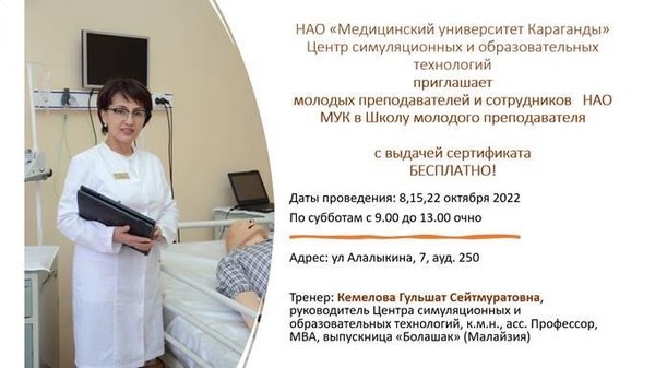 Симуляциялық және білім беру технологиялар орталығы «Қарағанды медицина университеті» КеАҚ BostanovaZ@qmu.kz Тел: WhatsApp) Уважаемые преподаватели! ЦСОТ приглашает профессорско-преподавательский состав НАО МУК на онлайн-обучение с выдачей сертификата по циклу повышения педагогической квалификации «Эффективный преподаватель» Целевая аудитория: ППС НАО МУК, которые ранее получили сертификаты по данному модулю и необходимо пройти ППК раз в 5 лет Дата проведения: 10 октября по 14 октября 2022 г. Место проведения: платформа WEBEX, с 15.00—18.00 ⏰Объем: 60 часов/1 неделя/2 кредита Обучение бесплатное. Запись до 8 октября время до 12.00 отправлять на почту BostanovaZ@qmu.kz Контакты: Центр симуляционных и образовательных технологий НАО «Медицинский университет Караганды» BostanovaZ@qmu.kz Тел: WhatsApp)