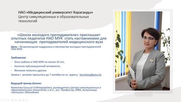 Құрметті ұстаздар! «Жас ұстаз мектебі» ҚМУ-дың тәжірибелі оқытушыларын жаңадан келген оқытушыларға тәлімгер болуға шақырады. Мақсаты – ҚМУ жас оқытушыларына тегін қолдау көрсету және тәлімгерлік ету Талаптар: • ҚМУ-да кемінде 10 жыл жұмыс тәжірибесі • Ғылыми белсенділігінің болуы • Басқаларға көмектесу ниеті болу керек Өтініштерді 7 қазанға дейін электронды пошта арқылы kemelova@qmu.kz жіберуге болады.