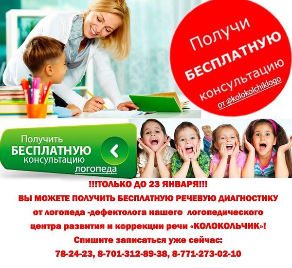время определять и исправлять нарушенные звуки. И если все еще нет каких-то из предыдущих навыков (контакта, понимание речи, игр с предметами и игрушкам), это серьезная проблема, так как на появление навыков нужно время, а оно ограничено. К школе ребенок должен не только развить речь, но и скорректировать произношение звуков, развить память, внимание, логическое мышление. На все это нужно время. Логопедический центр развития и коррекции речи «Колокольчик » приглашает на индивидуальные и групповые занятия! Мы проведем речевую диагностику Вашему ребенку и поможем справиться с любыми речевыми нарушениями! Опытные педагоги раскроют перед Вашим ребенком целый мир увлекательных приключений, занимательных развивающих и коррекционных занятий, которые помогут каждому ребенку подготовиться к школе и полностью раскрыть свои возможности! Справки по телефону:,, г.Караганда, пр. Н.Абдирова, д.44/2 @kolokolchiklogo @kolokolchiklogo @kolokolchiklogo