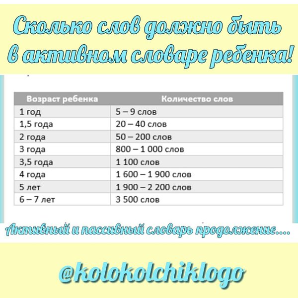 нка в 6 лет – около 3500 слов. Не стоит паниковать, если вы вдруг обнаружили, что ребенок говорит чуть-чуть меньше слов, чем в норме. Каждый ребенок индивидуален, и развивается в своем темпе. Есть детки, которые начинают говорить ближе к 2 годам, при этом всё понимают уже в 1—1,5 года. Если все же у вас есть сомнения или вопросы относительно развития вашего малыша, для собственного спокойствия проконсультируйтесь у специалистов нашего логопедического центра развития и коррекции речи «Колокольчик». Мы всегда рады помочь Вам! Как правило, включение определенных игр на развитие словарного запаса в совместное времяпровождение достаточно, что бы малыш догнал и даже перегнал сверстников. НО ОБ ЭТОМ УЖЕ В СЛЕДУЮЩИЙ РАЗ....