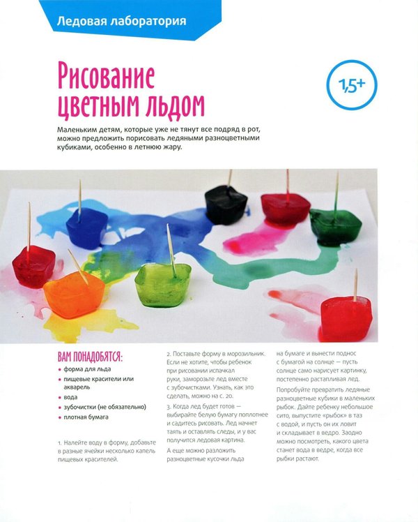 ладошки. . Краситель очень сложно отмывается от формы для льда, так что нужно или завести для игр отдельные формы, или потом не переживать из-за их внешнего вида.. В стеклянной посуде лучше ничего не замораживать, она непременно лопнет. . Перед тем как давать детям играть со льдом, ополосните его холодной водой, чтобы он не примерзал к пальцам. . Некоторым детям может не понравиться, что рукам мокро и холодно. Заранее приготовьте полотенце, чтобы можно было греть и вытирать руки. И поставьте рядом миску с теплой водой.