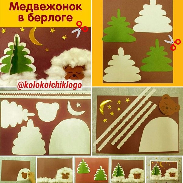 та • фигурные и обычные ножницы • клей ПВА, кисточка для клея • простой карандаш; черный фломастер Порядок выполнения работы: 1. Взрослый готовит для ребенка заготовки: • елочки разного цвета (две из зеленой цветной бумаги и две из белой; белые елочки должны быть по размеру больше на 5 мм) • сугроб из белой бумаги; мордочка спящего медведя из цветной коричневой бумаги • луна и звездочки из металлизированной бумаги желтого цвета • полоски белой бумаги, вырезанные фигурными ножницами, шириной 1см и разной длины для наклеивания их по краям будущей открытки 2. Дальше работу выполняет ребенок. Наклеивает вырезанную заготовку сугроба на основу из картона так, чтобы ровно соединить края. Можно ребенку помочь в этом. 3. В середине сугроба наклеивает мордочку медведя, который спит зимой в своей берлоге. 4. Намазав сугроб вокруг мордочки медведя клеем ПВА, выкладываем объемный сугроб из комочков ваты. 5. Затем берем елочки зеленую и белую. Намазываем клеем зеленую елочку, накладываем на белую елочку. Приклеиваем так, чтобы края белой елочки были немного видны (снег на ветках ели). 6. Ровно согнуть елочки пополам по длине. Помогает взрослый. 7. Ребенок намазывает клеем ПВА: у первой елки левую часть, у второй – правую и приклеивает их рядом друг с другом для получения одной объемной елочки. Затем склеить среднюю часть елки. 8. Ребенок приклеивает луну и звездочки. 9. По краям картона наклеивает вырезанные белые полоски для декоративного оформления открытки. Вот такая открытка у нас получилась!