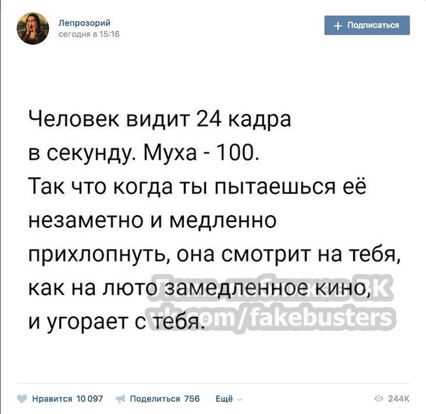 Ложь пабликов ВК | ЛПВК (16.07.2017): Исследования показывают, что человеческий глаз может заметить отдельное изображение на скорости 220 кадров в секунду. При этом у мухи скорость смены изображений составляет 300 кадров в секунду. А 24 кадра — это общемировой стандарт частоты киносъёмки и проекции.