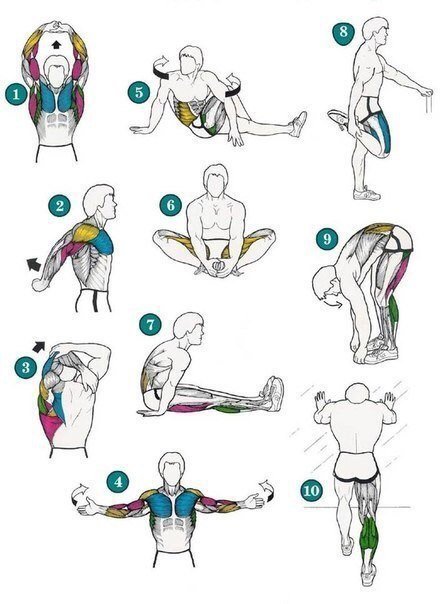 короткими, если уж очень хочется передохнуть. Комплекс упражнений Упражнение № 1: Поставить ноги на ширине плеч, руки на пояс. Выполнить наклоны вправо-влево. 12 раз. Упражнение № 2: Поставить ноги на ширине плеч, руки на пояс — круговые вращения туловищем. 8 раз влево, 8 раз вправо. Упражнение № 3: Поставить ноги на ширине плеч, руки за голову — круговые движения тазом. 8 раз влево, 8 раз вправо. Упражнение № 4: Поставить ноги вместе, руки на коленях — круговые вращения коленями. 8 раз влево, 8 раз вправо. Упражнение № 5: Согнуть вперед одну ногу, руки на поясе — круговые вращения согнутой в колене ногой. 8 раз одной ногой, затем 8 раз другой ногой. Упражнение № 6: Поставить ноги вместе — наклон вперед. Выполнить 12 пружинистых движений. Упражнение № 7: Поставить ноги на двойную ширину плеч — наклоны вперед. Выполнить 12 пружинистых движений. Упражнение № 8: Выпад в сторону. Переместить вес тела на правую ногу, левую вытянуть, затем поменять положение ног. 12 раз. Упражнение № 9: Выполнить выпад в левую сторону — переместить вес тела на левую ногу, правую вытянуть, разворачивая туловище вправо на 90 градусов, переместить вес тела на правую ногу, левую выпрямить, перейти в положение выпад вперед. 8 раз влево, 8 раз вправо. Упражнение № 10: Выполнить выпад в правую сторону, левую ногу вытянуть. Развернуть туловище в правую сторону, перейти в положение выпад вперед. Выполнить 8 раз в правую сторону, затем переместить вес тела на левую ногу и выполнить 8 раз в левую сторону. Упражнение № 11: Поставить стопы на полторы ширины плеч, захватить стопы руками, стараясь присесть как можно ниже, выпрямляя спину и выводя таз вперед. Выполнять в течение 1 минуты. Упражнение № 12: Встать на колени, руки захватить в замок. Выполнить приседания вправо-влево, попеременно касаясь ягодицами пола. 6 раз в каждую сторону. Упражнение № 13: Встать на колени, колени развести как можно шире, стопы развести в сторону. Выполнить 12 приседаний, касаясь ягодицами пола. Упражнение № 14: Сесть на пол, соединить ноги вместе и выполнить 12 пружинистых наклонов вперед. Упражнение № 15: Сесть на пол и развести прямые ноги в стороны, выполнить пружинистые наклоны вперед. 12 раз. Упражнение № 16: Сесть на пол, левую вытянуть, правую согнуть в колене и прижать стопу к левому бедру, выполнить наклоны вперед. 8 раз к левой ноге, затем поменять положения ног. Упражнение № 17: Сесть на пол, левую ногу вытянуть, правую ногу согнуть и отвести назад, выполнить наклон вперед. Сделать 12 пружинистых наклонов и поменять ноги. Упражнение № 18: Сесть на пол, сплести в «лотос» и выполнить наклон вперед. 12 раз. Упражнение № 19: Сесть на пол, соединить стопы вместе, затем локтями развести ноги в стороны. 16раз. Упражнение № 20: Сесть на пол попеременно заложить за шею правую и левую ноги. Упражнение № 21: Лечь на живот, согнуть руки в локтях. Выпрямить руки, прогнуть спину, голову поднять вверх. Задержаться в этом положении 30 сек. Упражнение № 22: Лечь на живот, взять руками за стопы. Прогнуть спину, голову поднять вверх. Задержаться в этом положении 30 сек. Упражнение № 23: Лечь на живот, согнуть ноги в коленях. Выпрямить руки, прогнуть спину. Задержаться в этом положении 30 сек. Упражнение № 24: Встать на колени, взяться за голеностопы руками, прогнуть спину назад. Задержаться в этом положении 30 сек. Упражнение № 25: Выполнить «гимнастический мос