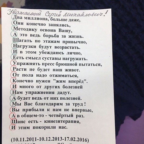 Сергей Бубновский (01.02.2017): Отличный акростих с сегодняшней презентации книги «Домашние уроки здоровья» в #свойкнижный в Одинцово