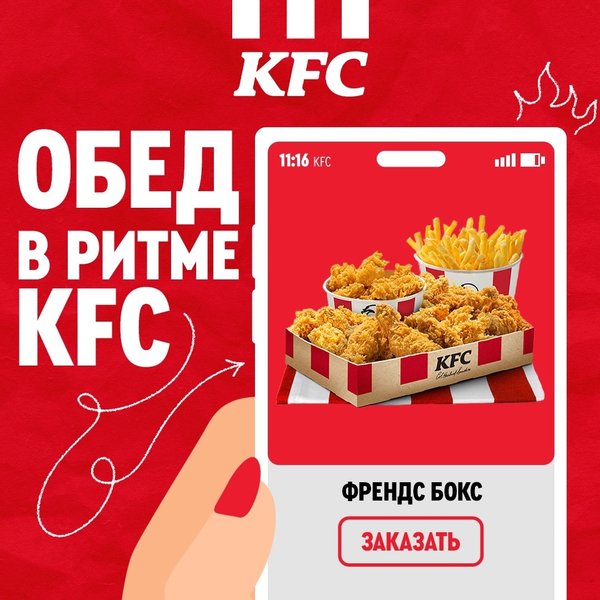KFC жеп, түскі ас ішейік! Түскі асқа не жейміз деп басыңды қатырмай-ақ қой. Ол істі бізге тапсыр! Сөлді ащы қанаттары бар Френдс Бокс жұмыста отырғанда көңілді көтеріп жіберері сөзсіз. KFC қосымшасында тапсырыс беріп, сөлді қанаттарды жеуге әріптестеріңді шақыр! __ Обед в ритме KFC! Не нужно ломать голову с выбором обеда — предоставь это дело нам! Френдс Бокс из сочных острых крылышек задаст правильное настроение рабочему дню. Заказывай в приложении KFC и зови коллег насладиться сочными крылышками!