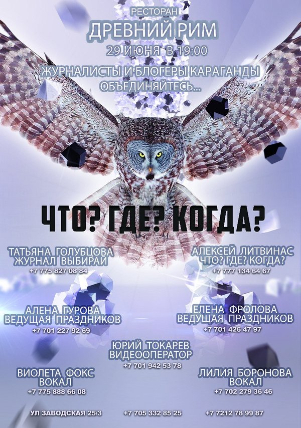 Дорогие журналисты, поздравляем вас с наступающим профессиональным праздником!!! И приглашаем вас принять участие в интеллектуально-развлекательной игре среди журналистской братии «Перо Хрустальной совы»! Игра пройдет в веселом и динамичном формате квиза. Участников ждет бодрящий умы микст из «Что? Где? Когда? », Своей игры, Угадай мелодии и оригинальных квизовых конкурсов! От игроков не потребуются энциклопедические знания и специальная подготовка. Собери команду из 4—8 человек, подай заявку и выиграй… Хрустальную сову! ЖУРНАЛИСТЫ КАРАГАНДЫ… — Читать дальше