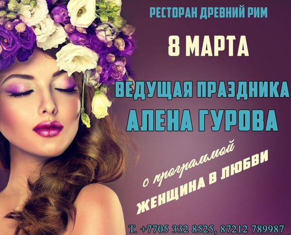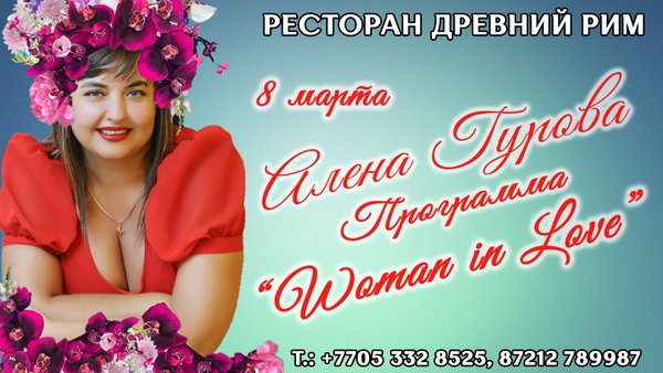 8 марта Ресторан Древний Рим приглашает всех в гости отметить самый любимый и прекрасный праздник Женщин, Весны и Любви И для вас, наши дорогие гости авторская, праздничная программа “Woman in Love”от самой веселой, позитивной и зажигательной ведущей Алены Гуровой, Которая сделает ваш вечер неповторимым и незабываемым Мы ждем вас в гости в Ресторан Древний Рим