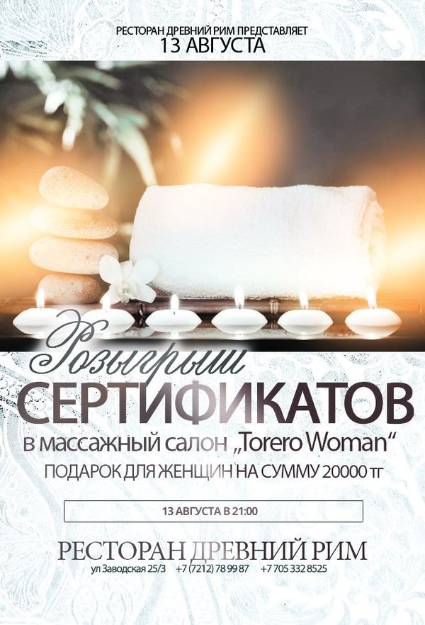 Ресторан Древний Рим приглашает всех в гости… Сегодня 13 августа, мы разыграем среди наших гостей замечательный подарок, Сертификат на сумму 20000 тенге от массажного салона Torero Woman. Розыгрыш состоится в 21.00 среди представительниц прекрасного пола…