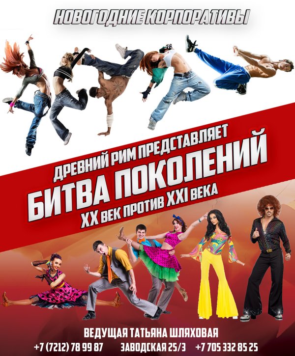 в битве поколений, 20 век против 21 века! Ведущая праздника Татьяна Шляховая. Весь вечер на сцене живая музыка. Вас ждет выступление лучших танцевальных коллективов города. А так же подарки и призы.. Мы ждем вас в гости в ресторане Древний Рим на Новогодние вечера!