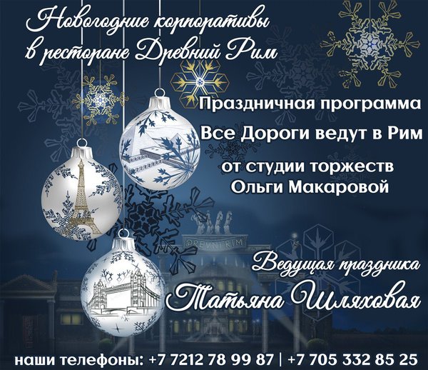 жете услышать знаменитые песни, увидеть зажигательные танцы и попробовать блюда разных народов мира. В ресторане Древний Рим вы окажетесь в настоящей новогодней сказке. Ведущая праздника Татьяна Шляховая, Праздничная программа от студии торжеств Ольги Макаровой Мы ждем вас в гости в ресторане Древний Рим!!!