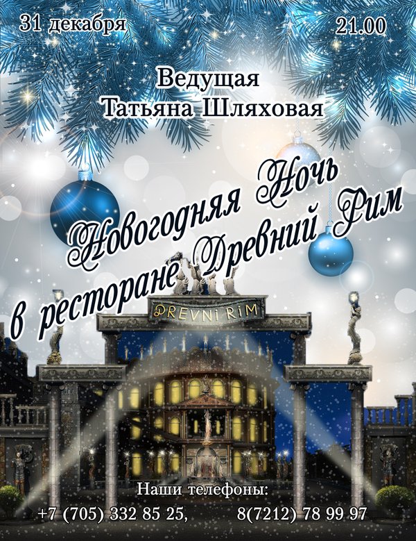 сможете услышать знаменитые песни, увидеть зажигательные танцы и попробовать блюда разных народов мира. В ресторане Древний Рим вы окажетесь в настоящей новогодней сказке. Ведущая праздника Татьяна Шляховая, Праздничная программа от студии торжеств Ольги Макаровой Мы ждем вас в гости в ресторане Древний Рим!!!