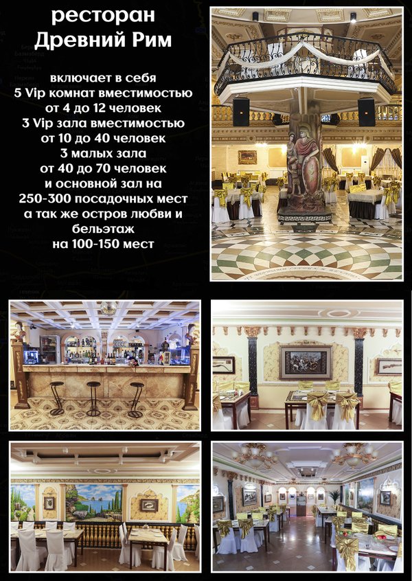 0—300 посадочных мест а так же остров любви и бельэтаж на 100—150 мест Мы ждем вас в гости в ресторане Древний Рим!!!
