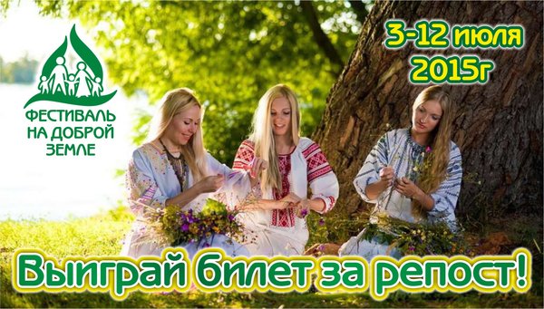 Фестиваль на Доброй Земле (06.03.2015): Приглашаем всех на Фестиваль на Доброй Земле который будет проходить с 3 по 12 июля! Также объявляем всем лотерею за репост. Победитель будет иметь возможность побывать на фестивале без внесения оргвзноса! Условия: нужно вступить в это сообщество и сделать репост на свою страницу и по возможности в свои сообщества;) Важно сохранять репост на своей странице до проведения розыгрыша. Розыгрыш состоится 26 апреля в 19:00 по Московскому времени.