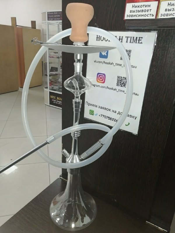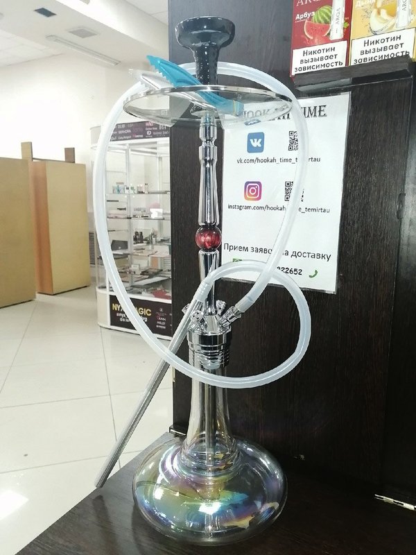 Красивый кальян, высота 63 см. до чаши, необычный дизайн и полная комплектация (чаша глиняная, щипцы, шланг с пружинкой, колба прозрачная с разноцветным переливом) На конце шахты установлен дифузор, благодаря ему курится тихо и легко. Очень просто собирается и разбирается. За счет его компактности в разобранном виде его очень удобно брать с собой на отдых. Цена этого симпатяги 22000 kzt.