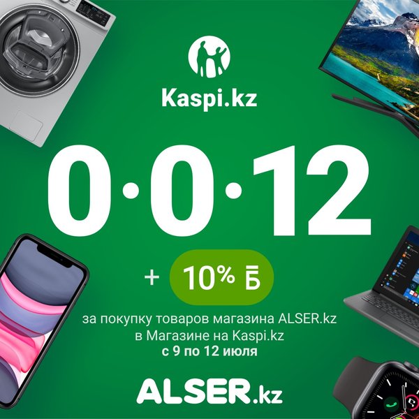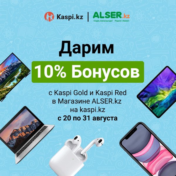 немесе сізді шиналар мен дәрумендер қызықтырады ма - бізде бәрі бар), оны 12 айға дейін бөліп төлеуге рәсімдейміз немесе әрбір саудаңызды Kaspi Gold немесе Kaspi Red арқылы төлеп, 10% бонус аламыз! Осындай керемет науқанды 2020 жылдың 9-шы шілдесінен 12-ші шілдесіне дейін пайдаланып қалыңыздар! Толық ақпарат Alser.kz сайтында