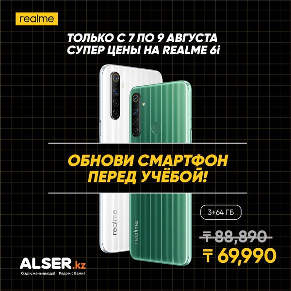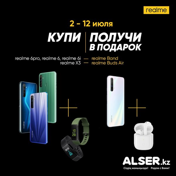 ды! X3 Superzoom (8+128) сатып алып, Buds Air-ды сыйлыққа және 6 Pro (8+128), 6 (8+128), 6 (4+128), 6i (4+128), 6i (3+64) смартфондарын сатып алып, Realme Band-ты сыйлыққа ал! Керемет сыйлығымен бірге жүретін Realme смартфондарының бірін тиімді бағада сатып алып, Realme-дің демалыс күндері өткізетін 100% cashback ұтыс ойынына қатыс! Толық ақпарат ALSER.KZ сайтында