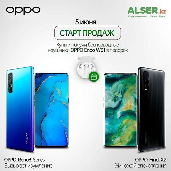 OPPO Find X2 және OPPO RENO 3 сериясы – бұл жай смартфондар емес, бұрын-соңды болмаған мүмкіндіктерді сыйлайтын технологиялар. Дизайны көздің жауын алып, қолыңызға ыңғайлы ұсталады. Көп еселі зум, түрлі-түсті дисплейі, қуатты артықшылықтары және әрбір смартфондағы сан түрлі ерекше шешімдер. Сонымен қатар жаңа өнімді сатып алғандағы қуанышты арттыру үшін флагмандардың бірін сатып алсаңыз, OPPO Enco W31 сымсыз құлаққабы түріндегі жағымды сыйлыққа ие боласыз.