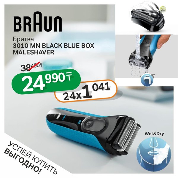 — Бритва 3010 MN BLACK/BLUE BOX MALESHAVER с двумя рядами тонких сверхострых лезвий всего за 24 990 тг вместо 38 490 тг;