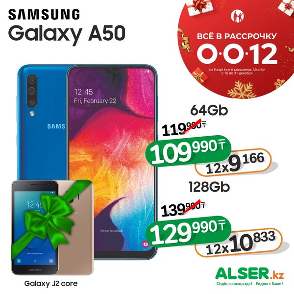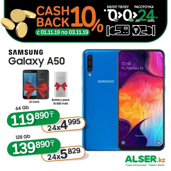 Приобретая модели Samsung Galaxy A50 64/128 Gb — Вы получаете в подарок смартфон J2 Core и Power Bank на 10000 MAh в дополнение к просто отличному кэшбеку в 10%! Все смартфоны Вы можете приобрести в рассрочку до 24-х месяцев.