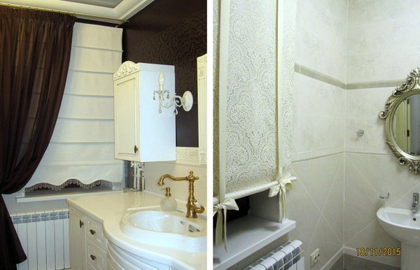 Ванные комнаты Если в вашей ванной комнате предусмотрено окно, то декоративная рулонная штора из плотной ткани, хорошо защитит от посторонних взглядов и днем, и ночью. Ленты и фактура на ткани придают нежность и изысканность изделию, декорирующее окно в ванной комнате.