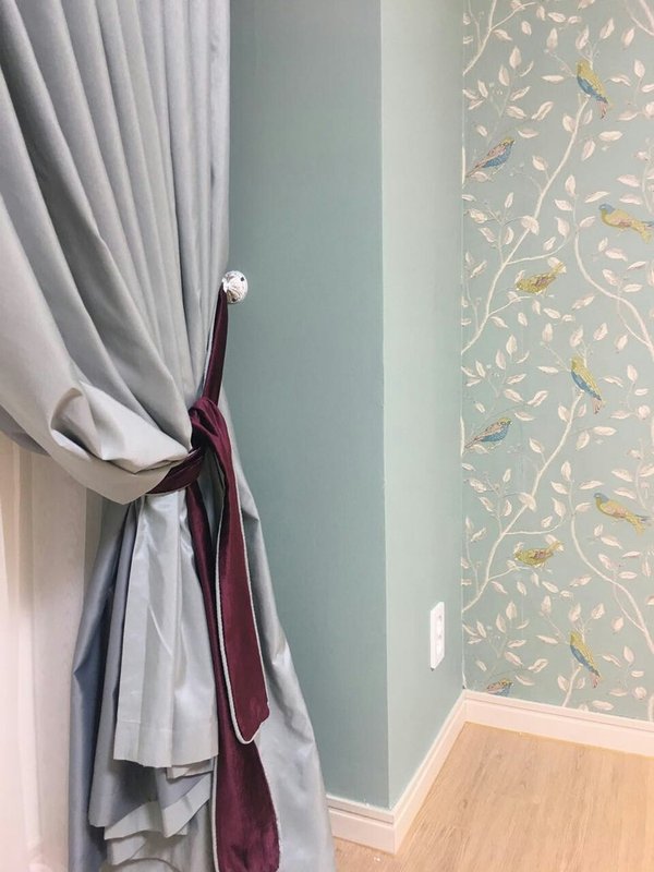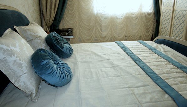 гантная спальня декорирована двойными портьерами из бирюзового бархата и жаккарда с классическим узором цвета ванили. Шторы и предметы мебели или декора, выполненные из бархата одного оттенка, всегда удерживают на себе пристальное внимание. Матовый бархат завораживает своей богатой текстурой и переливами. Использование таких изысканных деталей, как декоративные шелковые кисти, играют большую роль в оформлении окна, придавая композиции законченный вид. Тюлевая гардина, оформленная по типу «французской шторы», поддерживает стилистику мебели и создает в интерьере ощущение театральности.