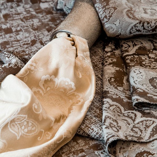 — Легкие жаккарды с эффектом дикого шелка. — Акцент на орнаменте благодаря мягкому и матовому фону. — 6 дизайнов в 10 актуальных оттенках. — Ширина тканей 140 см. Использование изнаночной стороны ткани вместе с лицевой открывает широкие возможности для интересных дизайнерских решений.