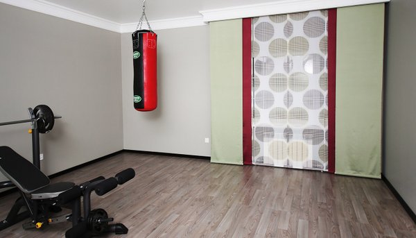 Комната для занятий спортом В комнате для занятий спортом установили лаконичные «японские» шторы, они идеально подходят для просторных помещений. Немного яркого цвета и геометрии в рисунке панелей добавят настроения и динамики пространству.