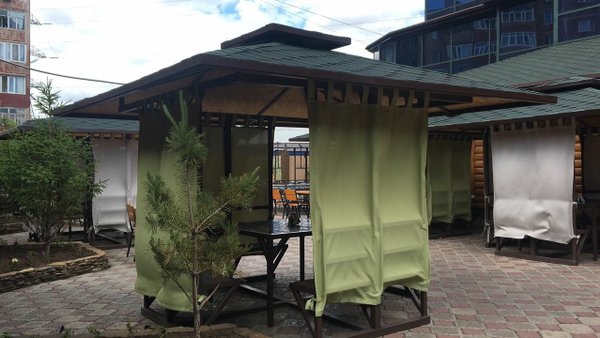 Шторы на завязках могут стать изюминкой интерьера в любом стиле. С их помощью легко зонировать помещение, они могут выглядеть лаконично, уютно, мило, оригинально, современно. Все зависит от того, из какой ткани выполнены шторы и завязки. Полотно в этом случае удобнее всего крепить к плотному карнизу или штанге, а завязки являются не только функциональным элементом, но и декоративным. Они добавляют дизайну интерьера легкость, воздушность, неформальный вид на фото уютная летняя терраса кафе