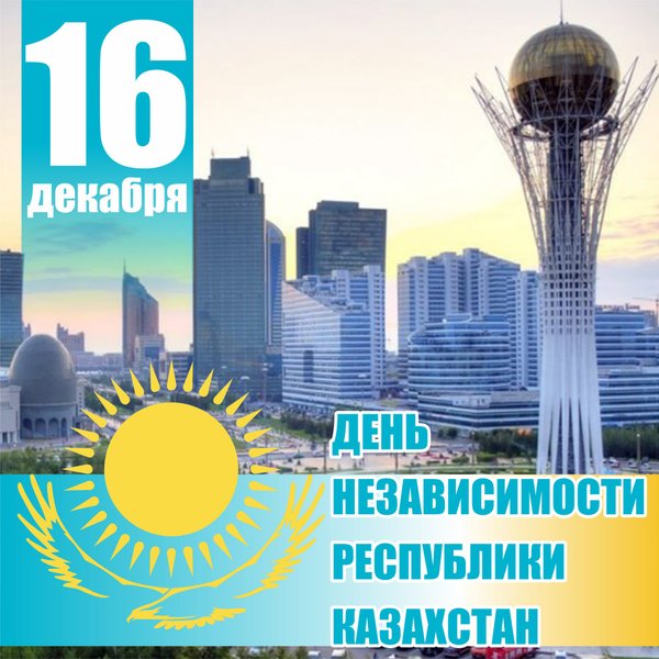 ДЕНЬ ГОСУДАРСТВЕННОЙ НЕЗАВИСИМОСТИ РЕСПУБЛИКИ КАЗАХСТАН — ГЛАВНЫЙ ГОСУДАРСТВЕННЫЙ ПРАЗДНИК, КОТОРЫЙ ЕЖЕГОДНО ОТМЕЧАЕТСЯ 16 ДЕКАБРЯ. В ЧЕСТЬ НАЦИОНАЛЬНОГО ПРАЗДНИКА ЭТОТ ДЕНЬ В РЕСПУБЛИКЕ ЯВЛЯЕТСЯ НЕРАБОЧИМ И СЛЕДУЮЩИЙ ДЕНЬ — 17 ДЕКАБРЯ — ТОЖЕ. 16 ДЕКАБРЯ 1991 ГОДА ВЕРХОВНЫЙ СОВЕТ ПРИНЯЛ ЗАКОН О НЕЗАВИСИМОСТИ И ГОСУДАРСТВЕННОМ СУВЕРЕНИТЕТЕ КАЗАХСТАНА. В ДЕНЬ ПРАЗДНИКА ПО ВСЕЙ СТРАНЕ ПРОХОДЯТ МАССОВЫЕ ГУЛЯНИЯ И ПРАЗДНИЧНЫЕ КОНЦЕРТЫ. С ПРАЗДНИКОМ!