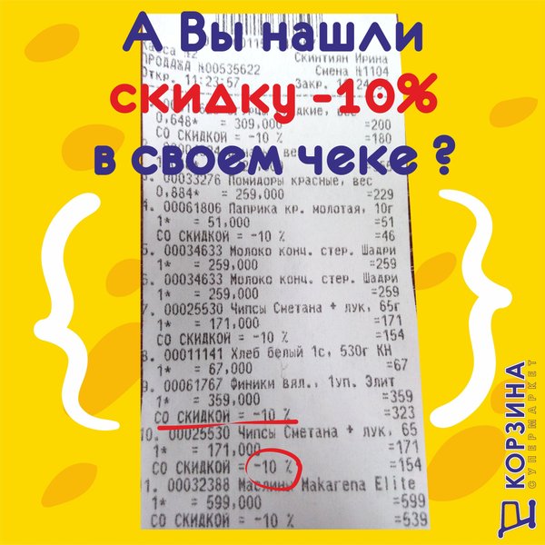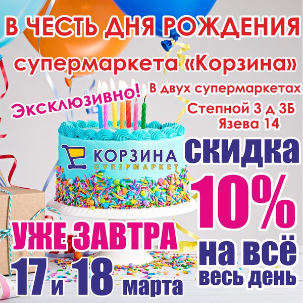 ДОРОГИЕ ПОДПИСЧИКИ!!! НАПОМИНАЕМ!!!! УЖЕ ЗАВТРА!!!! СОСТОИТСЯ ГРАНДИОЗНАЯ АКЦИЯ 17 И 18 МАРТА В ЧЕСТЬ ДНЯ РОЖДЕНИЯ СУПЕРМАРКЕТА «КОРЗИНА» СКИДКА 10% — НА ВСЁ! ВЕСЬ ДЕНЬ!!! ЭКСКЛЮЗИВНО в двух супермаркетах Язева 14 Степной 3 дом 3 б