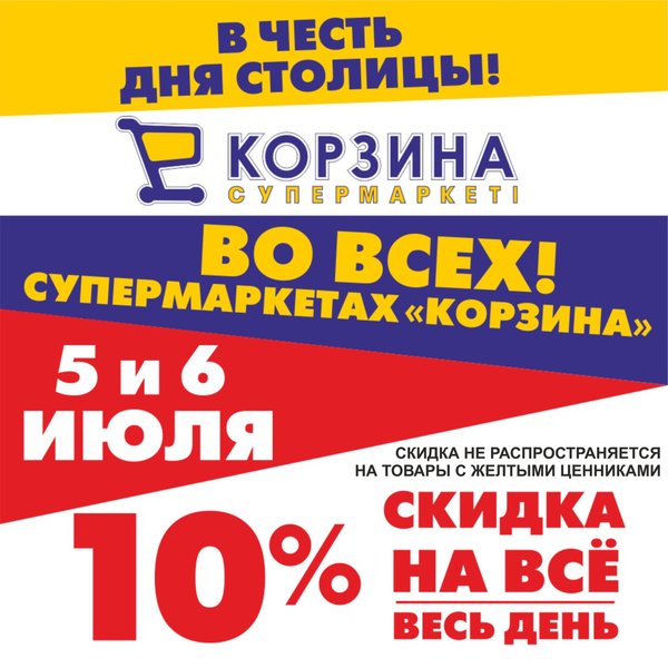 УВАЖАЕМЫЕ ПОДПИСЧИКИ! В честь Дня Столицы Республики Казахстан! Во всех супермаркетах «Корзина» ТОЛЬКО ДВА ДНЯ 5 И 6 ИЮЛЯ ВЕСЬ ДЕНЬ СКИДКА 10% НА ВЕСЬ АССОРТИМЕНТ скидка не распространяется на акционные товары на желтых ценниках. все наши ежедневные будние скидки отменяются, вместо них действует скидка 10% на все весь день! ЭКОНОМЬТЕ В КОРЗИНЕ!