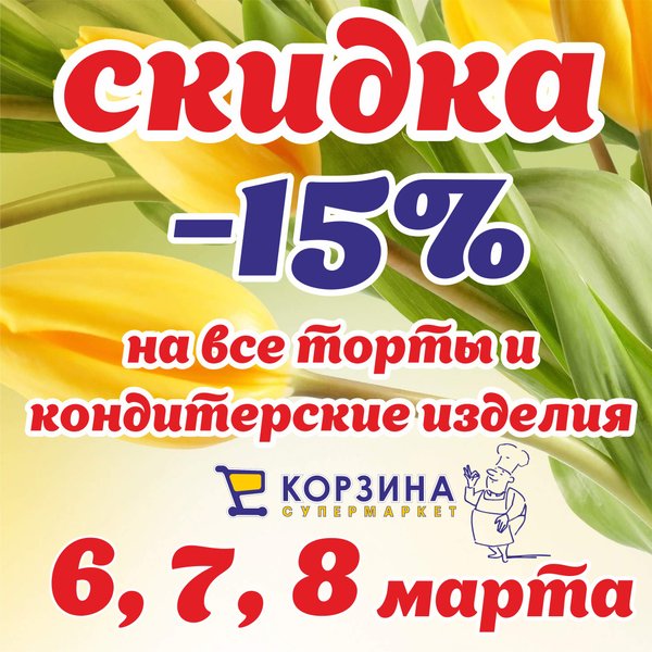 6,7,8 марта во всех супермаркетах «Корзина» СКИДКА 15% НА ВСЕ ТОРТЫ И КОНДИТЕРСКИЕ ИЗДЕЛИЯ!!!!