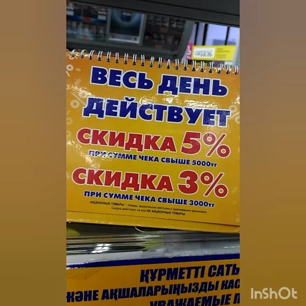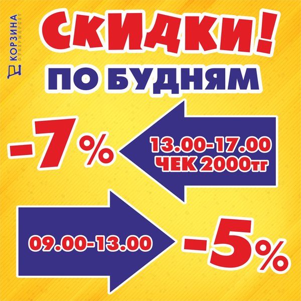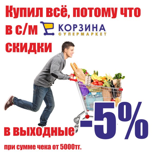 СКИДКИ КАЖДУЮ СУББОТУ И ВОСКРЕСЕНЬЕ ВЕСЬ ДЕНЬ СКИДКА 3% — ПРИ СУММЕ ЧЕКА ОТ 3 000 ТЕНГЕ СКИДКА 5%- ПРИ СУММЕ ЧЕКА ОТ 5 000 ТЕНГЕ АКЦИЯ ДЕЙСТВУЕТ ВО ВСЕХ СУПЕРМАРКЕТАХ «КОРЗИНА» СКИДКИ НЕ РАСПРОСТРАНЯЮТСЯ НА АКЦИОННЫЕ ТОВАРЫ И ТОВАРЫ НА «ЖЕЛТЫХ И ОРАНЖЕВЫХ ЦЕННИКАХ»