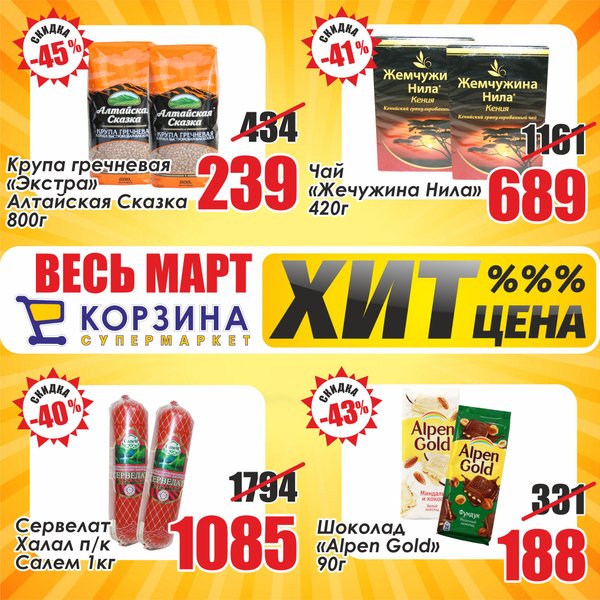 ДОРОГИЕ ПОДПИСЧИКИ! В СУПЕРМАРКЕТЕ «КОРЗИНА» — ХИТ ЦЕНА!!!! ТОЛЬКО В МАРТЕ!!! с 1 по 31 марта во всех супермаркетах «Корзина» акция «Хит цена». Только самые хитовые товары с сумасшедшими скидками до 50%! ЭКОНОМЬТЕ В «КОРЗИНЕ»!!!