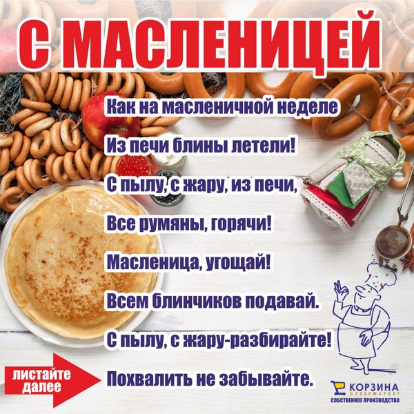 МАСЛЕНИЦА ИДЕТ! БЛИНЫ ДА МЕД НЕСЕТ!!! ВОТ И НАСТУПИЛА МАСЛЕНИЧНАЯ НЕДЕЛЯ. ПОЗДРАВЛЯЕМ ВСЕХ С ШИРОКИМ ПРАЗДНИКОМ!!! А ТЕМ КТО ПРОБОВАЛ НАШИ БЛИНЧИКИ ОТ С/М «КОРЗИНА» СОБСТВЕННОГО ПРОИЗВОДСТВА ВОПРОС: СКОЛЬКО ВИДОВ БЛИНЧИКОВ У НАС ЕСТЬ?