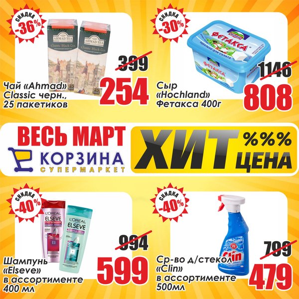 «Хит цена»! ВЕСЬ МАРТ во всех супермаркетах Корзина акция «Хит цена». Только самые хитовые товары с сумасшедшими скидками до 50%! Экономьте в Корзине!