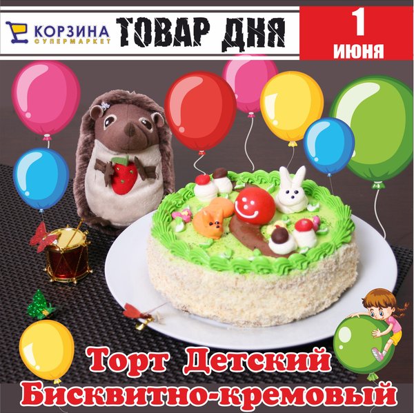 Дорогие подписчики! 1 июня во всех супермаркетах «Корзина» акция Товар Дня Торт Детский Бисвитно-Кремовый собственного производства 1 кг со скидкой 30% за 1270тенге.